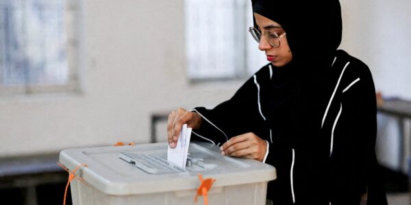 Mulher vota na eleição presidencial dos EUA de 2024 na escola Pittsburgh Manchester em Pittsburgh, Pensilvânia (5/11)