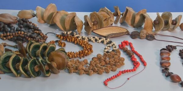 Depois da coleta, as sementes passam por tratamento antifúngico e secagem. A Leucena, por exemplo, é descascada e cozida antes de ser usada. O resultado são peças versáteis, como explica a artesã Deise Almeida: “Depois de pronto essa linda peça que pode usar como colar, cinto e pulseira”.