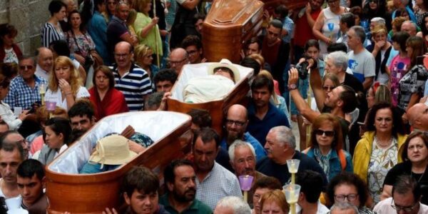 Pessoas levam nos ombros caixões com pessoas vivas no seu interior, durante a procissão de Santa Marta de Ribarteme, em 2019