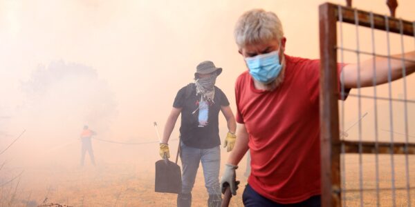 Pessoas usam coberturas faciais enquanto um incêndio florestal assola Veiga das Meas, perto de Verin, província de Ourense, Galícia, na Espanha.