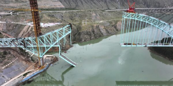 Fotos aéreas da agência oficial de notícias Xinhua mostram um trecho da construção caído sobre o rio Amarelo na província de Qinghai, no noroeste da China.