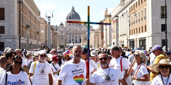 Grupo de fiéis católicos segura cruz com cores da bandeira LBTQIA+ diante da Basílica de São Pedro, no Vaticano, em 6 de setembro de 2025.