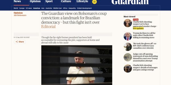 ‘Marco para a democracia brasileira, mas a luta não acabou’: em editorial, ‘Guardian’ apoia a condenação de Bolsonaro