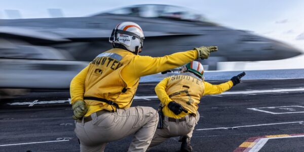Caça de combate dos Estados Unidos decola, sob instrução de técnicos de voo, do porta-aviões USS Gerald Ford durante treinamento em outubro de 2025.