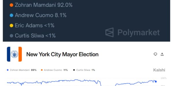 A disputa está entre Mamdani, Andrew Cuomo, que concorre como independente, e Curtis Sliwa, do Partido Republicano. Veja abaixo como estavam as apostas às 11h30: A casa Polymarket apontava que: 92% dos apostadores acreditavam que Mamdani deve ser eleito, enquanto 8,1% acreditavam que será Cuomo na Kaishi estava: 90% para Mamdani e 11% para Cuomo; na Predict It estava: US$ 0,90 para Mamdani e US$ 0,13 para Cuomo (nessa casa de apostas, os participantes compram “ações” que representam os candidatos. Quanto mais valorizada estiver uma ação, maior é a confiança…