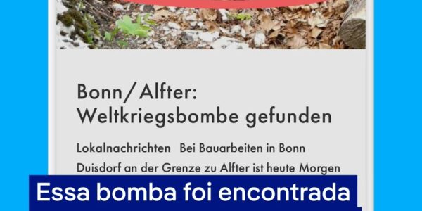A bomba foi encontrada durante obras de tubulação na cidade de Bonn. De origem americana, ela tinha 125 quilos e precisou ser desativada e removida. “E de repente, simplesmente, o Ordnungsamt, que é um órgão do governo aqui na Alemanha, bateu a campainha aqui em casa e falou que todo mundo teria que sair para poder desativar essa bomba. Tenho um bebezinho de quatro meses, uma outra…