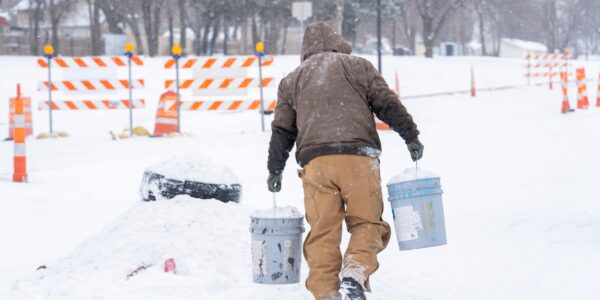 Um homem carrega baldes de neve no estacionamento da oficina de pneus onde…