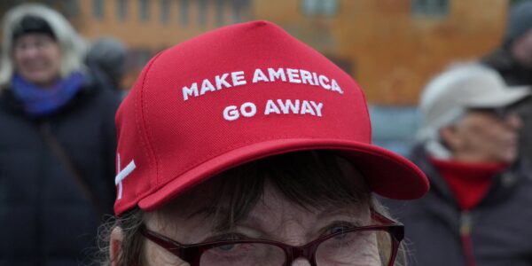 Mulher traja boné com dizeres “Faça a América ir embora”, durante protesto em Copenhague, em 17 de janeiro de 2026.