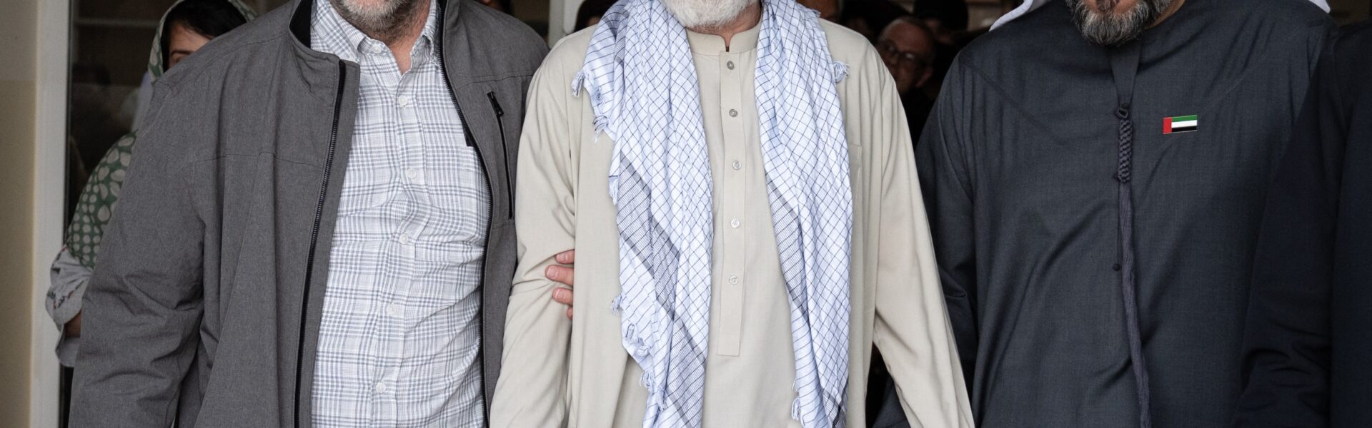 O cidadão americano Dennis Coyle (C), após ser libertado pelo Talibã, caminha com o embaixador dos Emirados Árabes Unidos em Cabul, Saif Mohammed Al-Ketbi — Foto: Wakil Kohsar / AFP