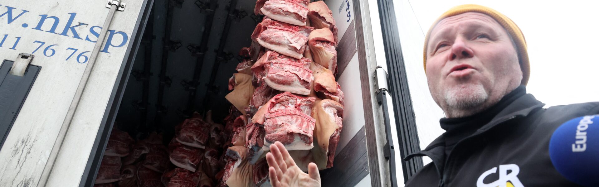 Agricultor francês do sindicato Coordination Rurale em frente a caminhão com carne durante protesto contra acordo UE-Mercosul — Foto: FRANCOIS LO PRESTI / AFP