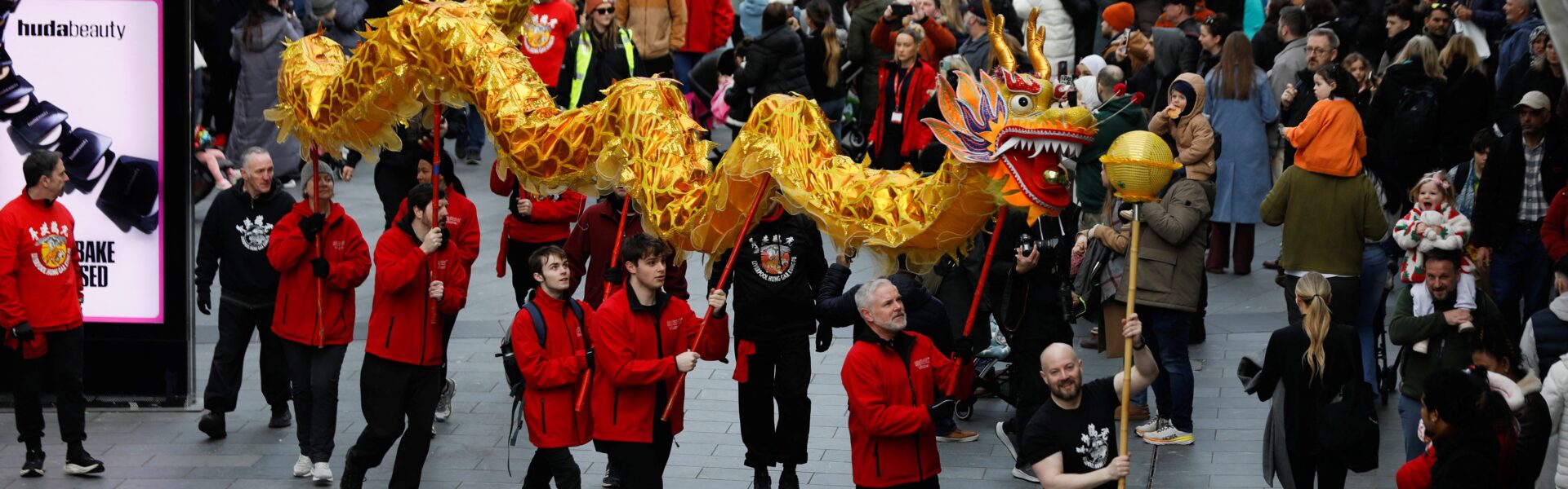Apresentação do dragão durante procissão do Ano Novo Chinês no Reino Unido, em foto de 14 de fevereiro de 2026 — Foto: Reuters/Temilade Adelaja
