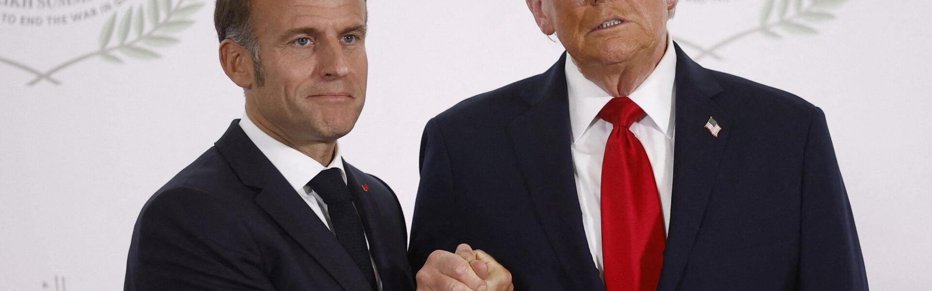 Presidente dos Estados Unidos, Donald Trump, cumprimenta o presidente da França, Emmanuel Macron, na recepção da cúpula da paz em Gaza sediada em Sharm El-Sheik, no Egito, em 13 de outubro de 2025. — Foto: Yoan Valat/Pool via REUTERS