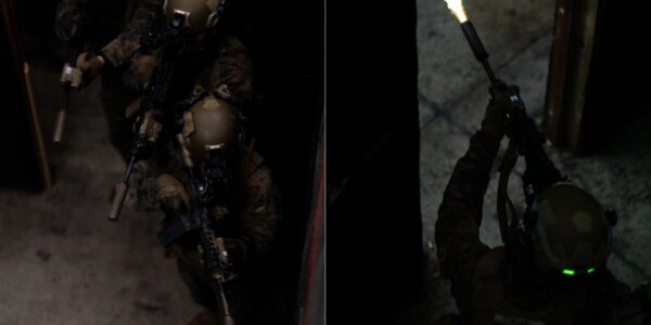 Tropas treinando tiro e situações de combate de curto alcance com silenciador e com camuflagem na selva;