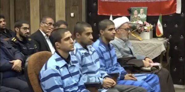 Saleh Mohammadi, Mehdi Ghasemi e Saeed Davodi durante julgamento, segundo a IHR