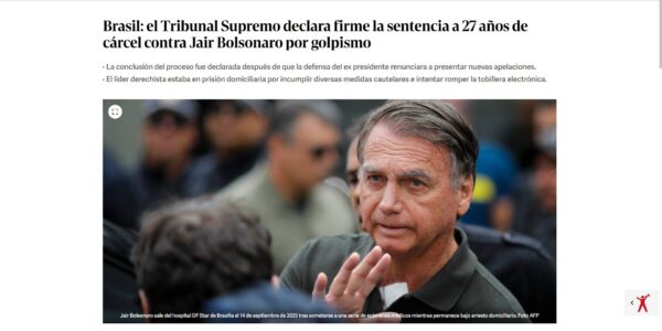 O ex-presidente Jair Bolsonaro (PL) começou a cumprir pena de prisão em regime fechado nesta terça-feira (25). A medida foi determinada pelo ministro Alexandre de Moraes, do Supremo Tribunal Federal (STF). A notícia repercutiu na imprensa internacional.