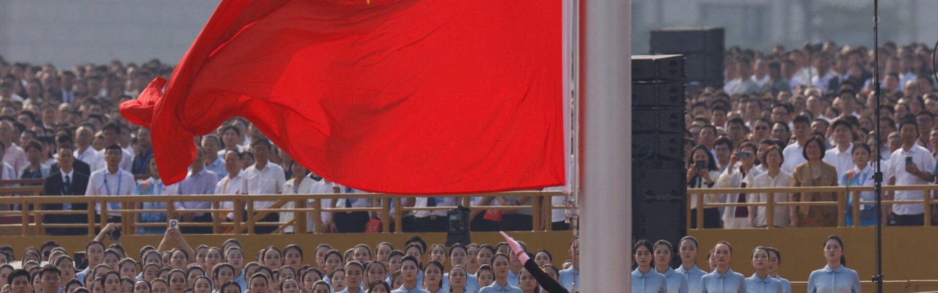 Pessoas participam de uma cerimônia de hasteamento de bandeira durante um desfile militar para marcar o 80º aniversário do fim da Segunda Guerra Mundial, em Pequim, China, 3 de setembro de 2025 — Foto: REUTERS/Tingshu Wang