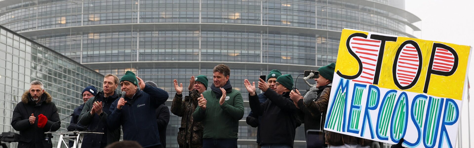Agricultores europeus comemoram em Estrasburgo, na França, a decisão do Parlamento Europeu de levar acordo comercial UE-Mercosul à Justiça, no dia 21 de janeiro de 2026 — Foto: Yves Herman/Reuters