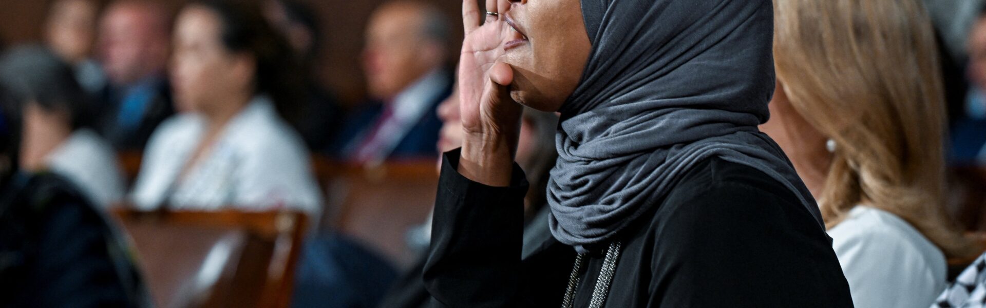 A deputada democrata Ilhan Omar, de Minnesota, reage ao discurso de Trump no Congresso — Foto: Kenny Holston/Pool via REUTERS