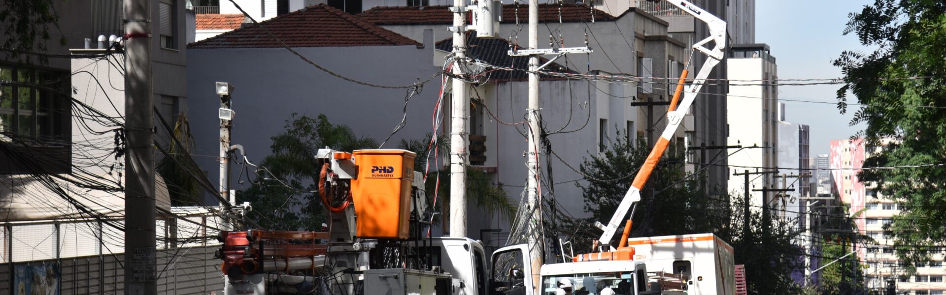 Bairros de São Paulo tem falta de luz pelo terceiro dia seguido devido ao vendaval que atingiu a cidade. Na foto funcionários da Enel trabalhando na Rua Eça de Queiroz, na Vila Mariana, nesta sexta feira (12). — Foto: Roberto Casimiro/Fotoarena/Estadão Conteúdo