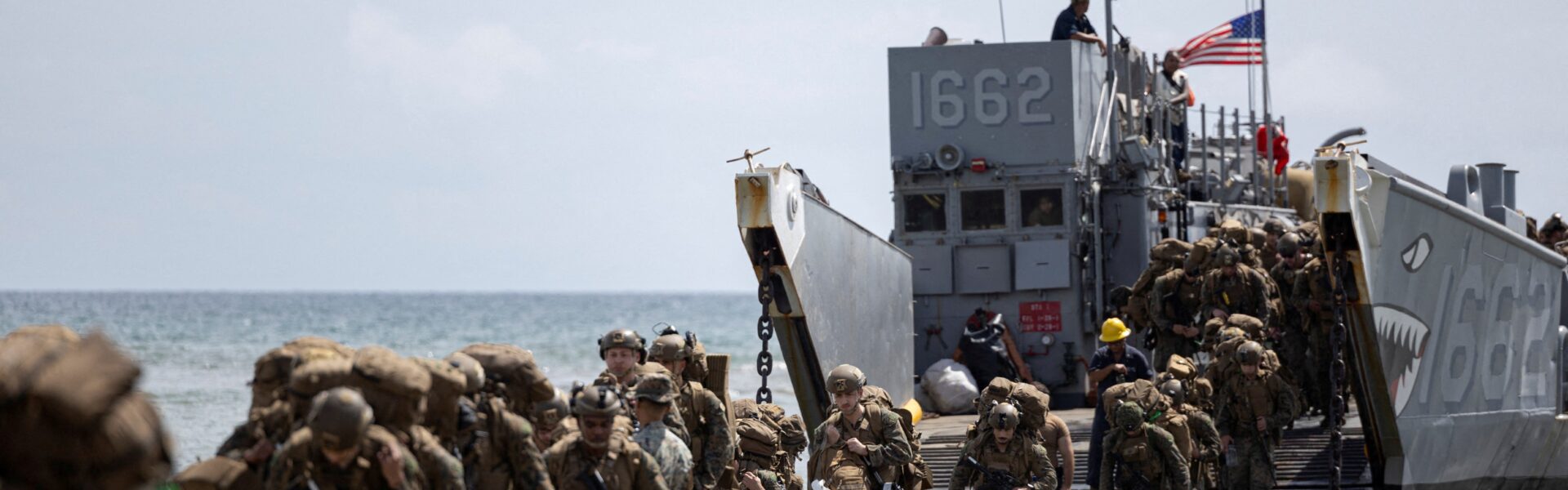 - O vídeo exibe militares desembarcando de um navio em uma praia, carregando armamentos e mochilas.