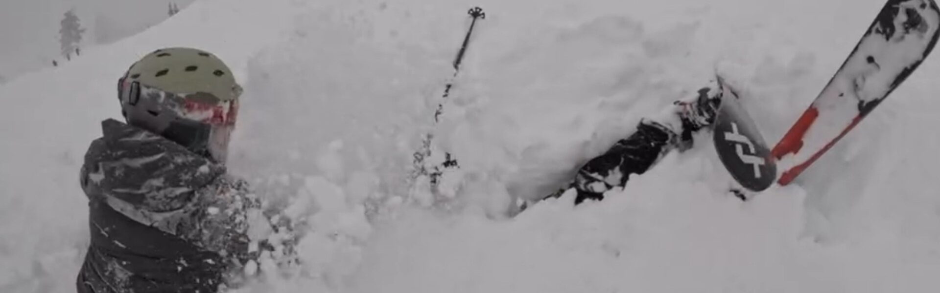 - O registro, gravado pelo esquiador Carson Schmidt, mostra o percurso de uma descida de esqui na estação Palisades Tahoe. Ao chegar ao final, ele percebe um par de esquis saindo diretamente de um monte de neve à frente e pergunta ao amigo: “Ele está bem?”.