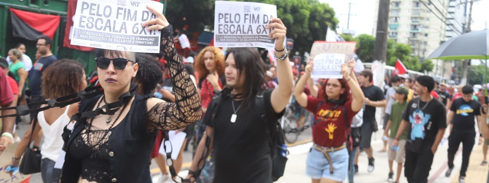 Manifestantes protestam pelo fim da escala 6×1 com faixas e cartazes. — Foto: Cláudio Pinheiro / O Liberal