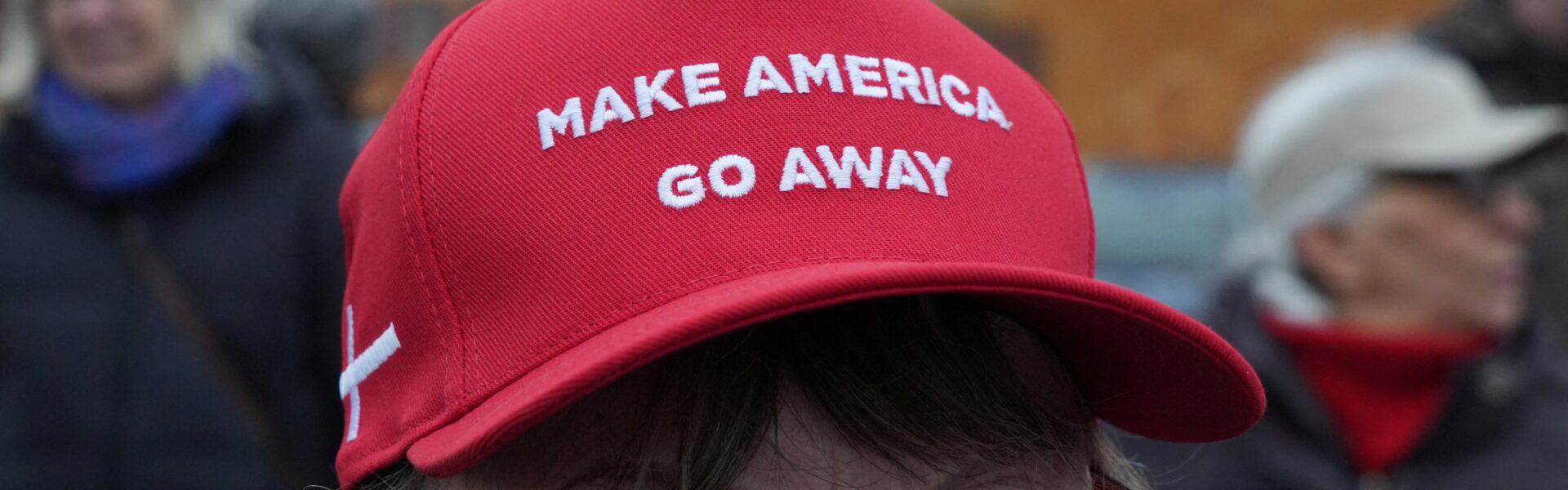 Mulher traja boné com dizeres “Faça a América ir embora”, durante protesto em Copenhague, em 17 de janeiro de 2026. — Foto: Tom Little/ Reuters