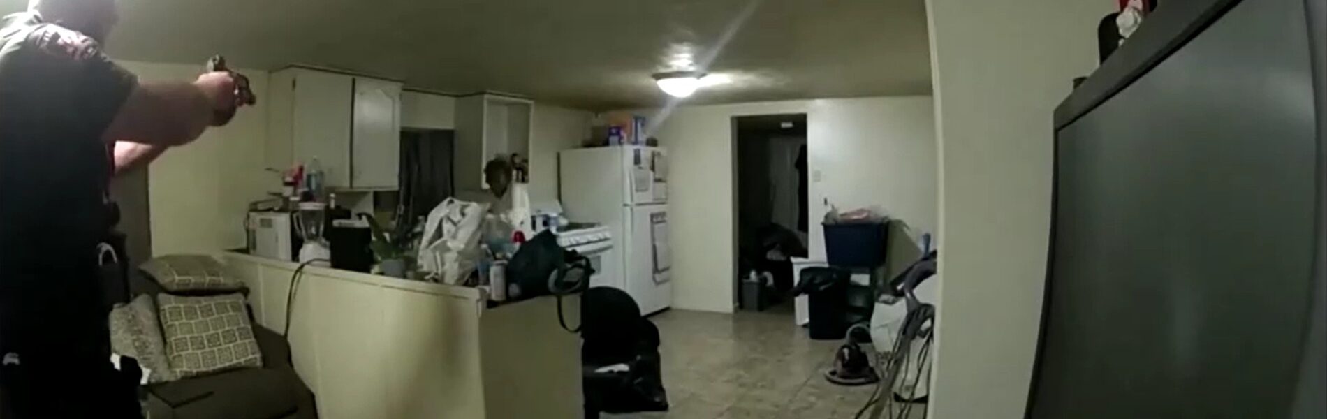 Ela foi baleada por estar segurando uma panela com água fervendo. As imagens são fortes e podem ser vistas no vídeo abaixo.