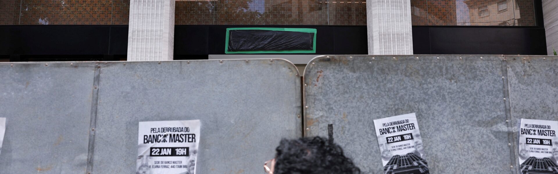 Foto de 23 de janeiro de 2026 mostra que a sede do Banco Master, no Itaim Bibi, na Zona Sul de São Paulo, foi cercada por tapumes e o logo da instituição financeira foi coberto — Foto: Amanda Perobelli/Reuters
