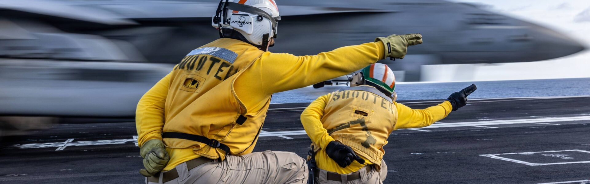 Caça de combate dos Estados Unidos decola, sob instrução de técnicos de voo, do porta-aviões USS Gerald Ford durante treinamento em outubro de 2025. — Foto: Zamirah Connor/Marinha dos EUA