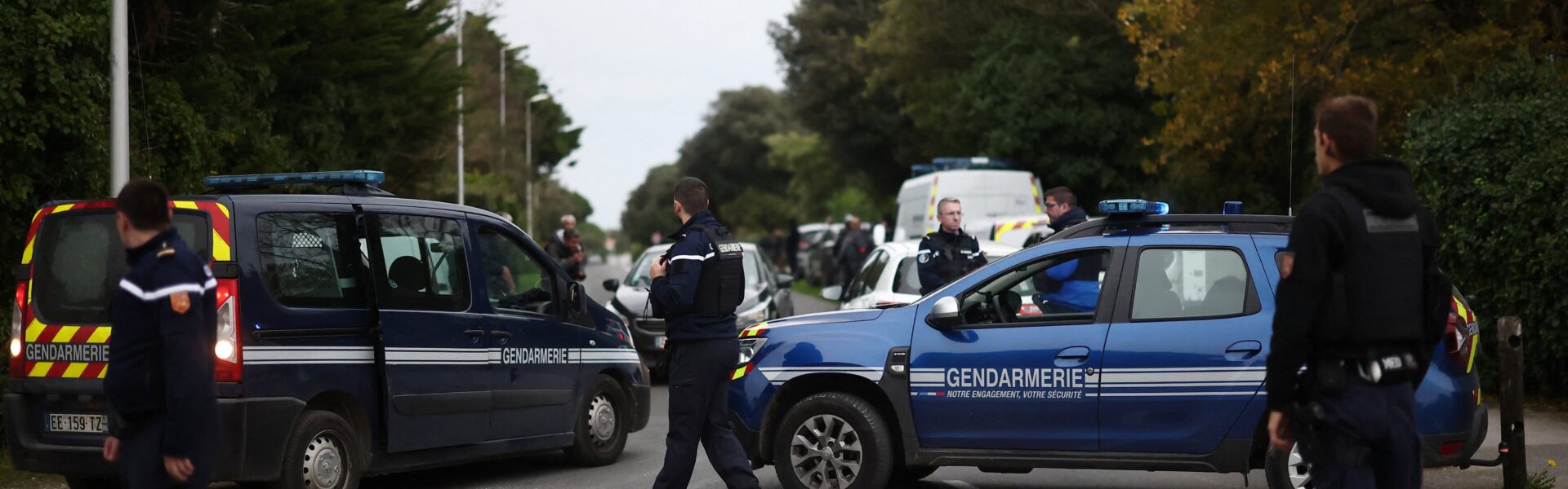 Policiais franceses isolam perímetro de atropelamento de pedestres e ciclistas em estrada da ilha de Olerón, na costa oeste da França, em 5 de novembro de 2025. — Foto: REUTERS/Stephane Mahe