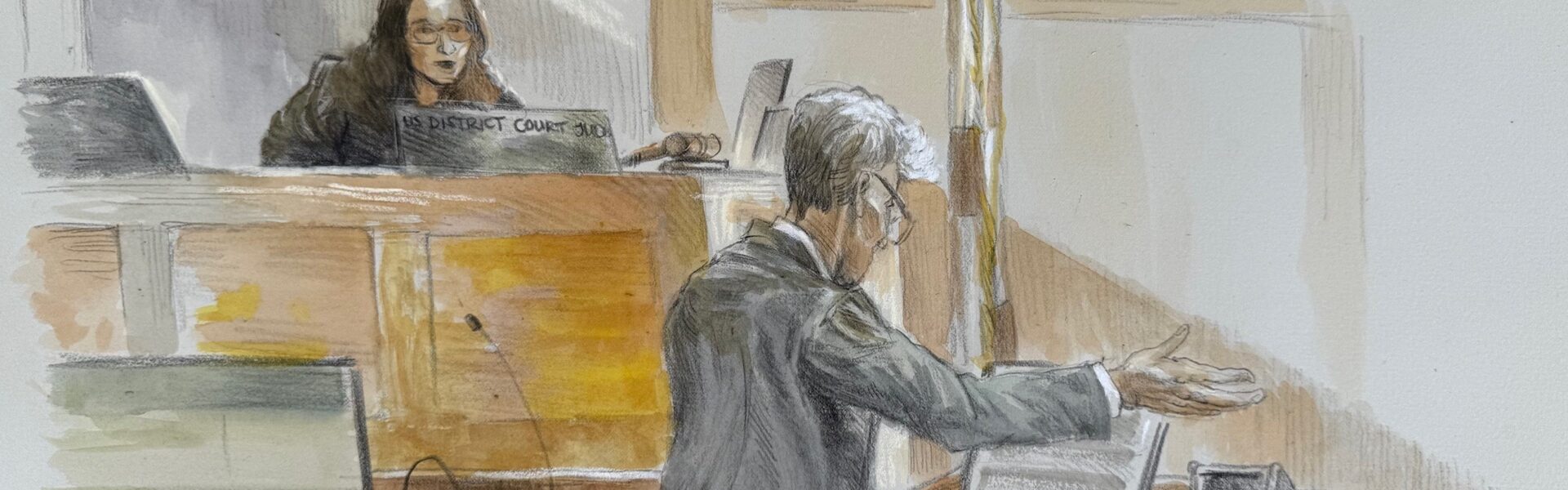 Esboço do tribunal mostra a juíza distrital dos EUA, Aileen Cannon, ouvindo Ryan Routh durante seu julgamento em 23 de setembro de 2025. — Foto: Lothar Speer via AP