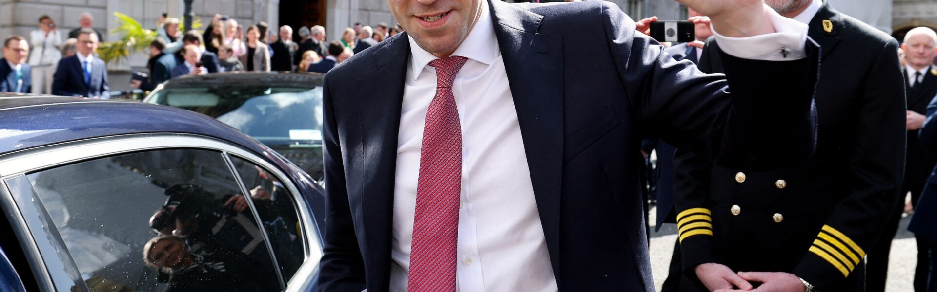 Simon Harris acena para apoiadores ao sair da sede do Parlamento irlandês — Foto: MAXWELLS / HOUSES OF THE OIREACHTAS / AFP