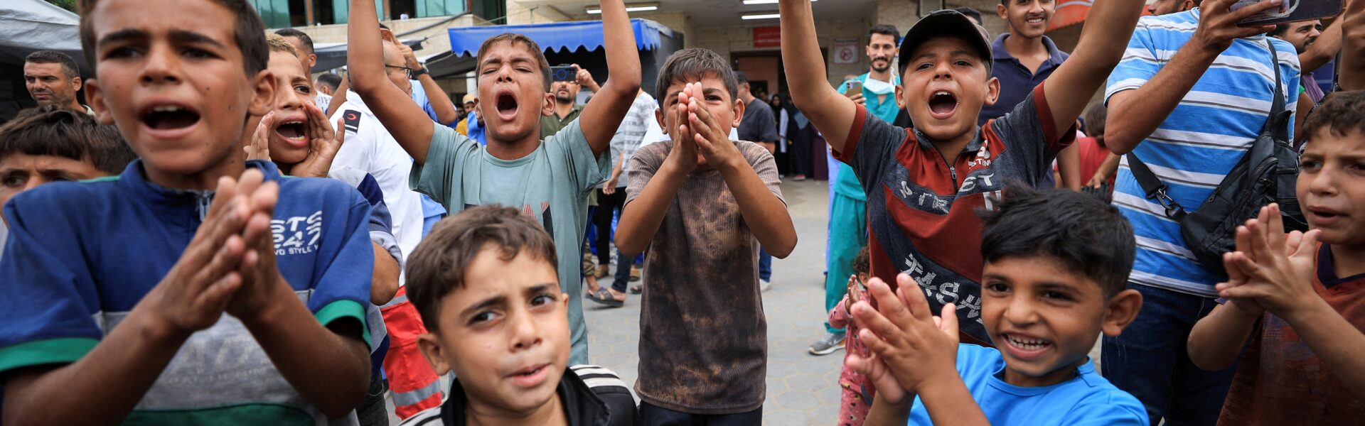 Crianças palestinas comemoram em frente a hospital no centro da Faixa de Gaza — Foto: REUTERS/Dawoud Abu Alkas