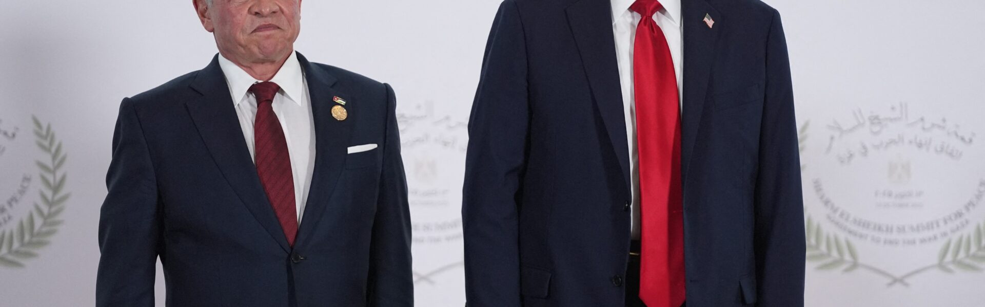 Presidente dos Estados Unidos, Donald Trump, cumprimenta o rei Abdullah II da Jordânia na recepção da cúpula da paz em Gaza sediada em Sharm El-Sheik, no Egito, em 13 de outubro de 2025. — Foto: Evan Vucci/Pool/AFP