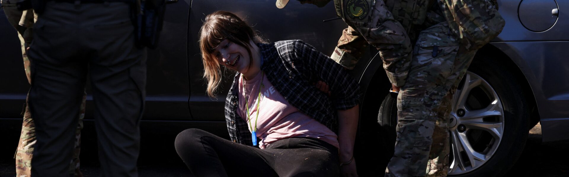 Manifestante é detida durante operação do ICE em Charlotte, na Carolina do Norte, em 17 de novembro de 2025 — Foto: REUTERS/Sam Wolfe