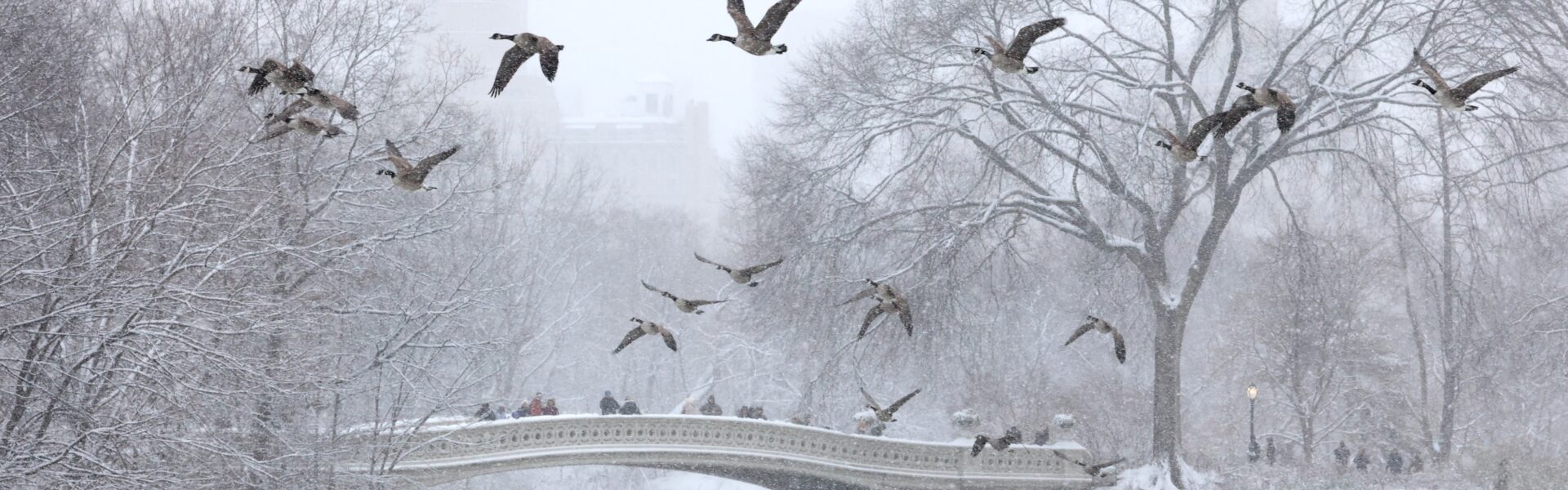 Gansos voam enquanto pessoas caminham em ponte no Central Park, em Nova York, em meio a uma nevasca que cobriu a cidade na manhã de 27 de dezembro de 2025 — Foto: Timothy A. Clary/AFP