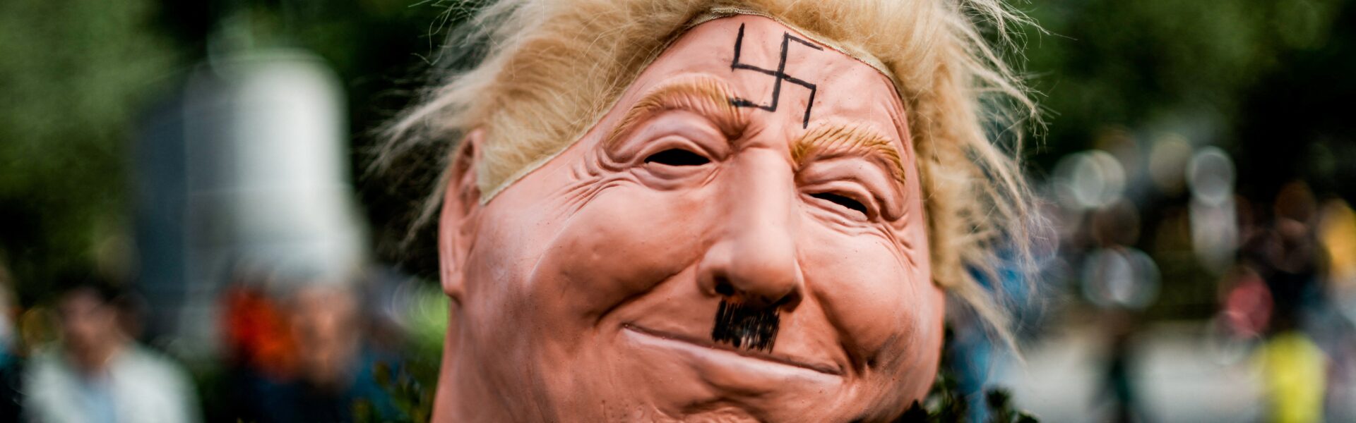 Uma máscara retratando o presidente dos Estados Unidos, Donald Trump, com uma suástica na testa, é exibida durante o protesto “No Kings” contra as políticas do governo, em Nova York, em 18 de outubro de 2025. — Foto: REUTERS/Eduardo Munoz