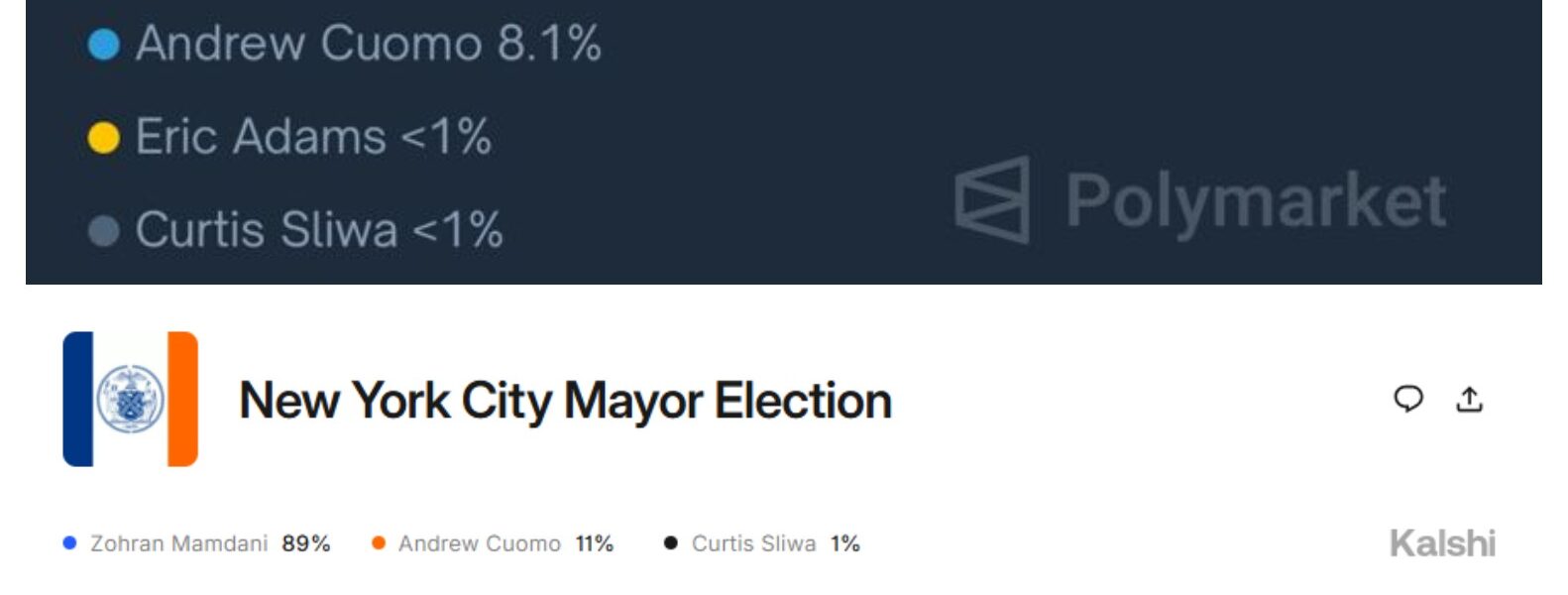 - na Predict It estava: US$ 0,90 para Mamdani e US$ 0,13 para Cuomo (nessa casa de apostas, os participantes compram “ações” que representam os candidatos. Quanto mais valorizada estiver uma ação, maior é a confiança dos apostadores de que aquele candidato será eleito.).