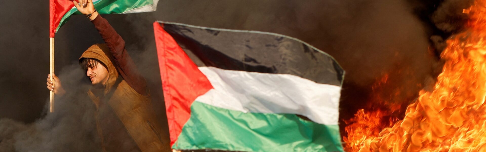 Homem segura bandeira da Palestina durante confronto com forças de Israel, em 27 de janeiro de 2023 — Foto: Mohammed Salem/Reuters