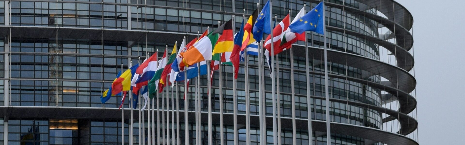 Bandeiras de países da União Europeia na sede do Parlamento Europeu, em Estrasburgo, França — Foto: Hassan Anayi/Unsplash