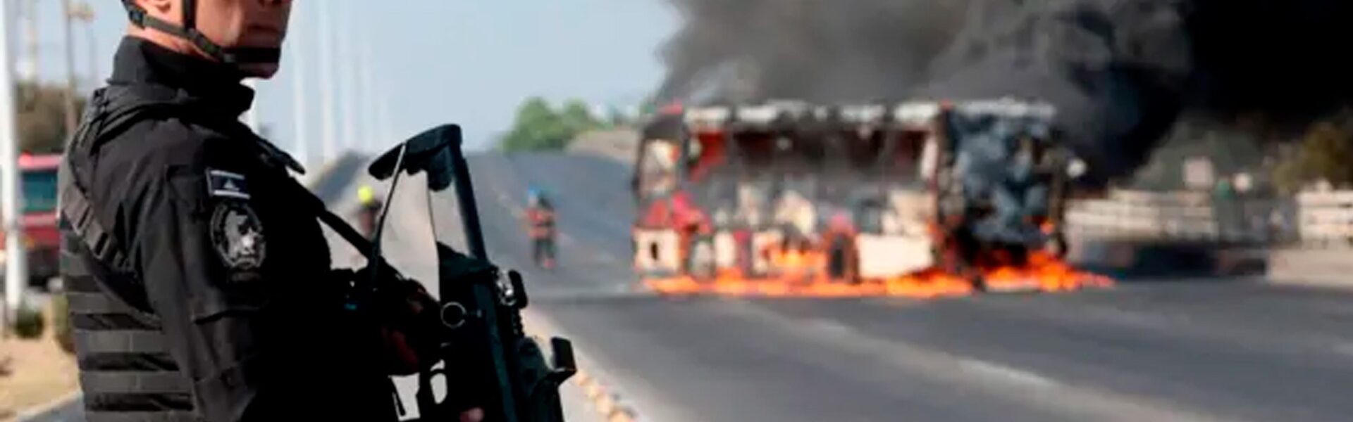 Agente de segurança segura metralhadora em frente a ônibus em chama em Zapopan, no estado de Jalisco, no México, após morte de traficante — Foto: Ulises Ruiz/AFP via Getty Images