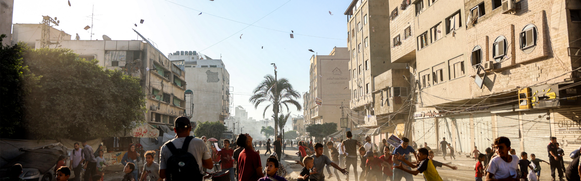 Palestinos da Cidade de Gaza observam panfletos jogados pelo Exército israelense com ordens de evacuação em 9 de setembro de 2025. — Foto: Omar Al-Qattaa/AFP