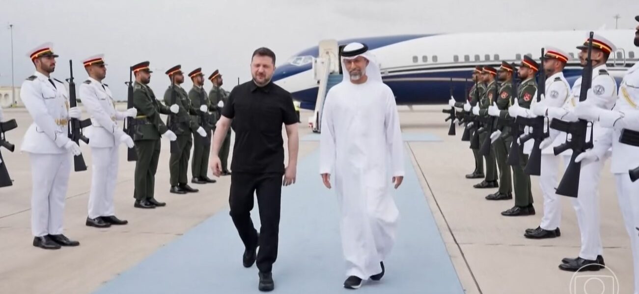 Presidente da Ucrânia visita países do Golfo e fecha acordos de cooperação de defesa militar — Foto: Reprodução/Jornal Nacional