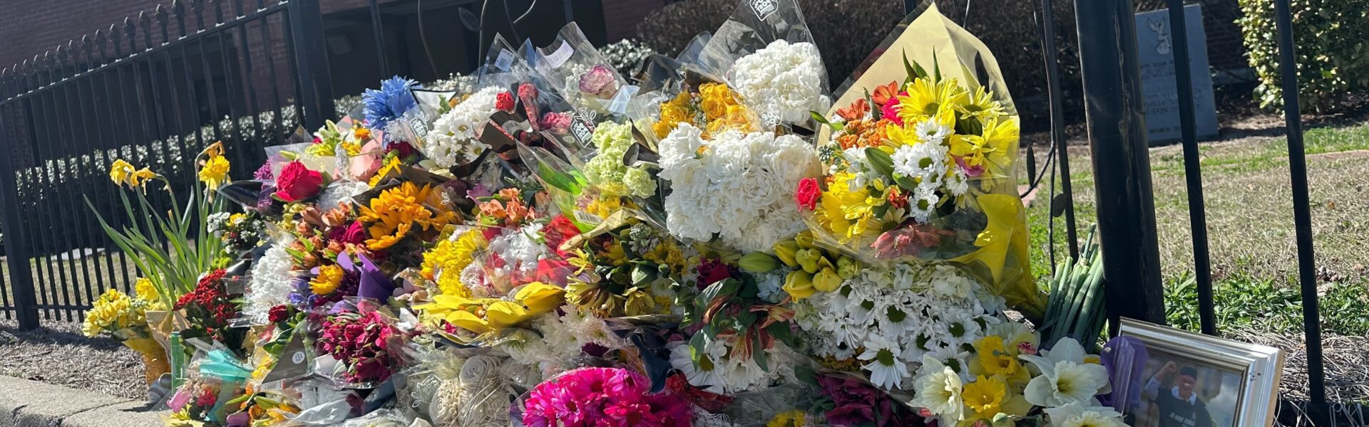 Estudantes e colegas de trabalho deixaram um memorial improvisado com flores em uma cerca em frente à escola.