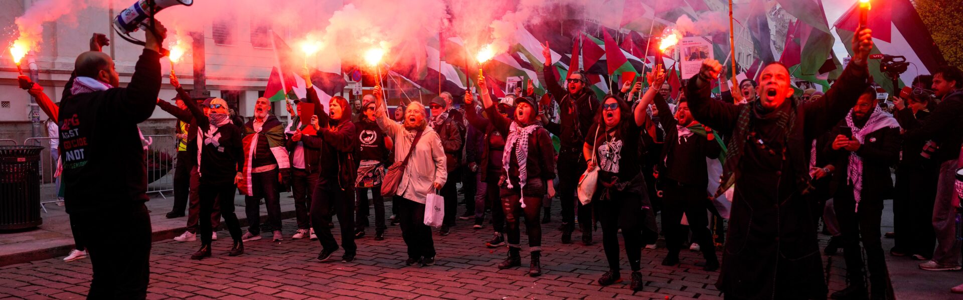 Marchando em direção ao estádio Ullevaal com bandeiras e sinalizadores palestinos, os manifestantes se reuniram do lado de fora, prometendo continuar até o pontapé inicial, enquanto prédios próximos exibiam faixas penduradas nas varandas.