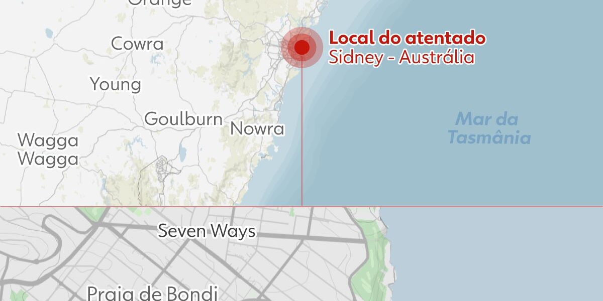 Infográfico mostra onde fica a praia de Bondi, na Austrália, onde um atentado no domingo (14) deixou mortos — Foto: Arte g1