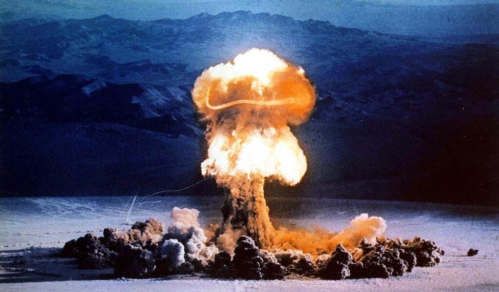Nuvens de fogo eclodem durante teste nuclear realizado pelos EUA no estado de Nevada em 1955. — Foto: Departamento de Energia dos EUA via AP