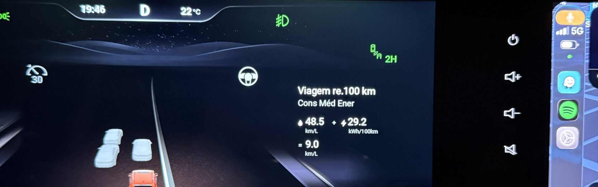 Nesse cenário, que favorece o motor elétrico e mantém o motor a combustão desligado, o consumo ultrapassou 40 km/l e chegou a 48,5 km/l — consumo que se esperaria de uma moto Honda CG 160, não de um carro com aerodinâmica e peso de pouco mais de duas toneladas.