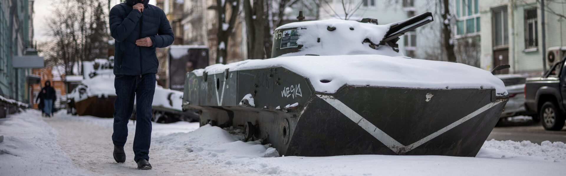 Uma pessoa caminha ao lado de um veículo blindado russo capturado em meio à invasão russa da Ucrânia. — Foto: HENRY NICHOLLS/AFP